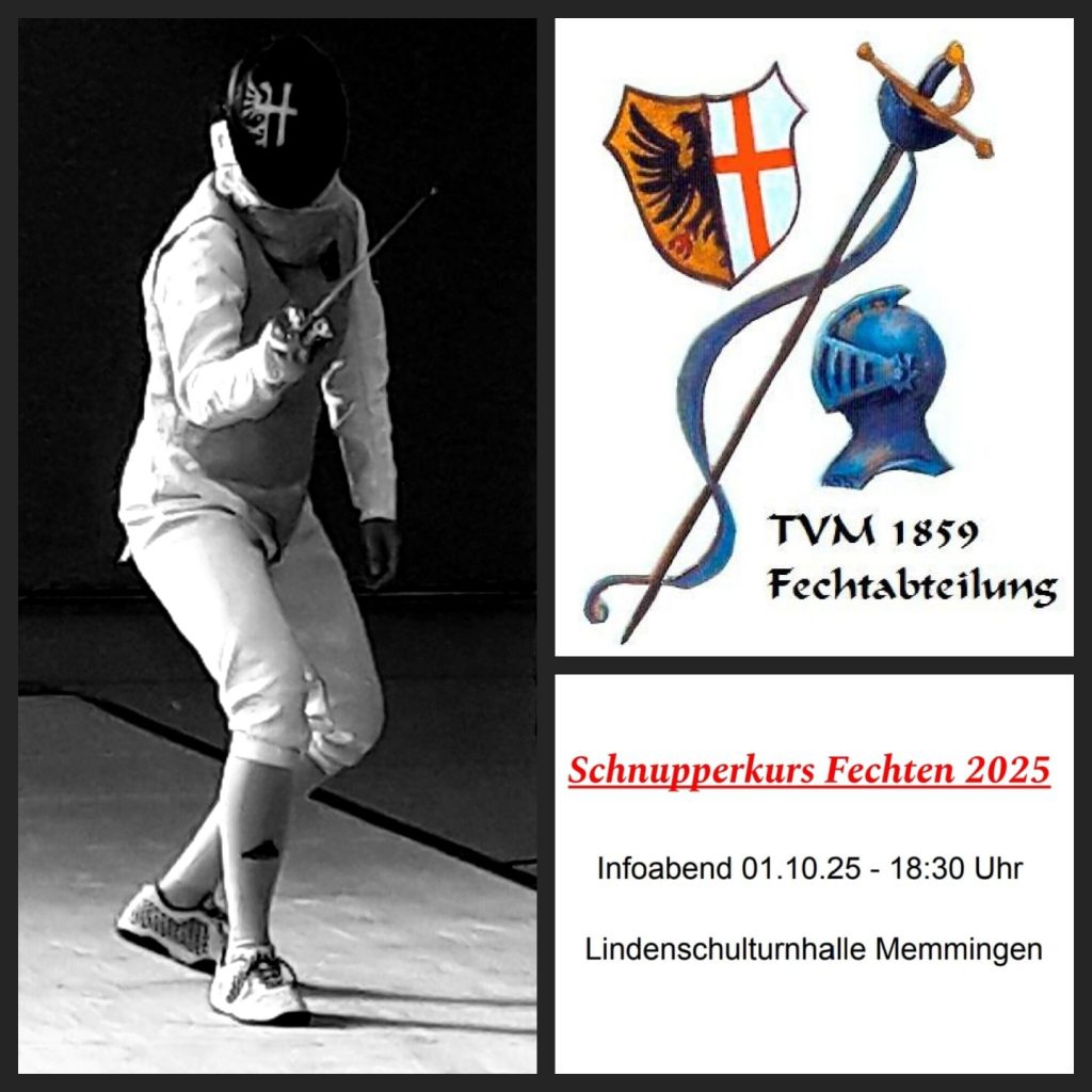 Am Mittwoch den 01. Oktober 2025 lädt die Memminger Fechtabteilung alle Interessierten herzlich zu einem Infoabend für den kommenden Schnupperkurs ein. Dieser findet ab 18:30 Uhr in der Turnhalle der Lindenschule (Maserstraße 2, 87700 Memmingen) statt.